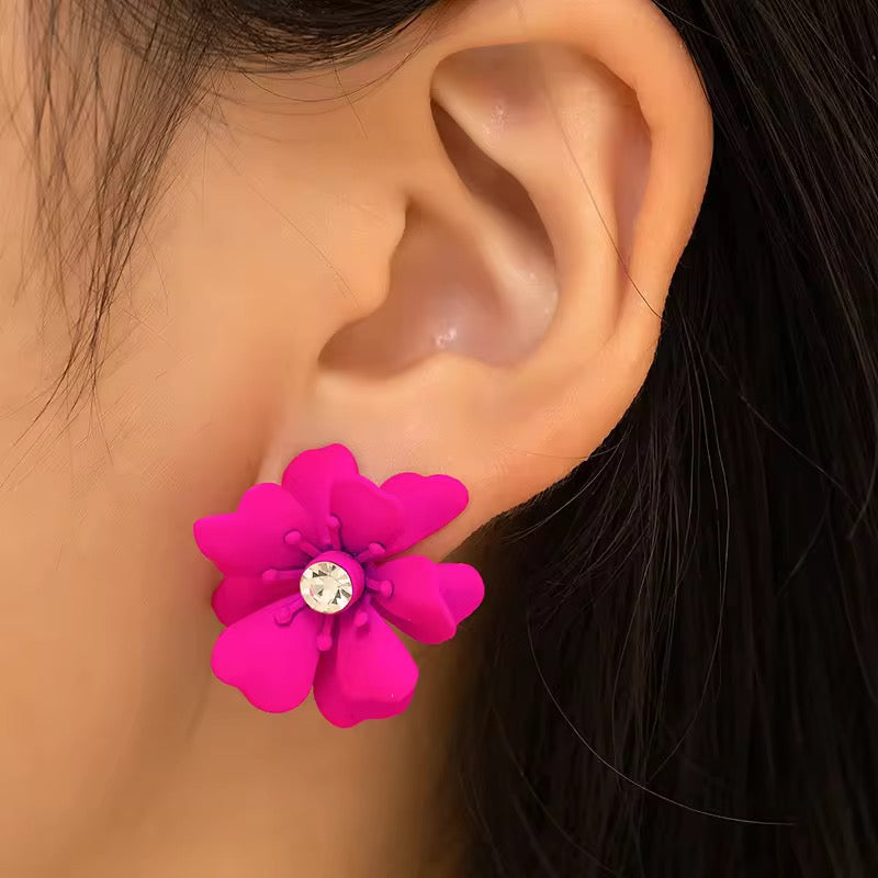 Turn heads with these stunning floral stud earrings, crafted to bring a vibrant and playful touch to your look. Featuring layered matte petals and a dazzling crystal centerpiece, these earrings strike the perfect balance between bold and elegant. Their lightweight design ensures comfortable wear while making a striking statement.